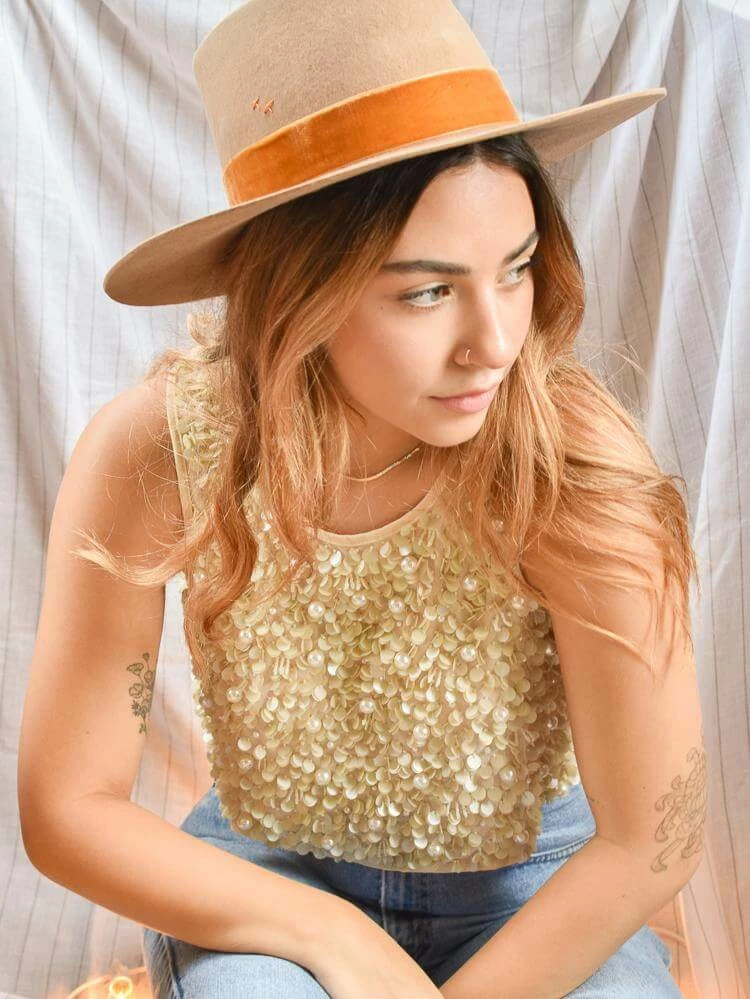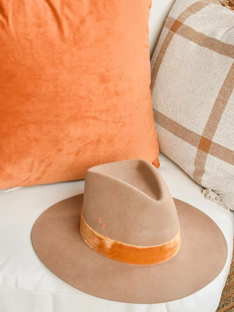 A stylish brown fedora makes the perfect addition to your fall wardrobe. Meet Lack of Color’s Benson Tri in Teak. It features a tall triangle crown, rich burnt orange velvet ribbon trim and decorative “xx” embroidery on the side. Pair it with the Hello Pumpkin sweatshirt for an easy fall outfit. Available at Confête in brown and beige. UPF rating: 50+.