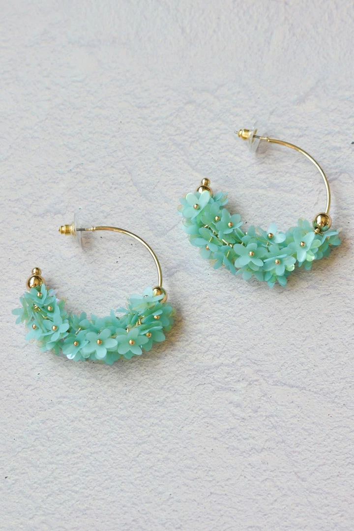 Add some flower power to your look with these Teal Floral Hoops featuring teal petals strewn around a simple gold hoop stud.