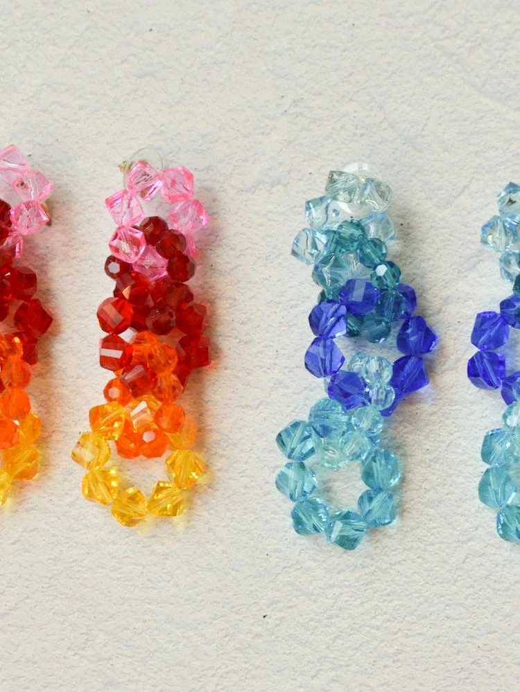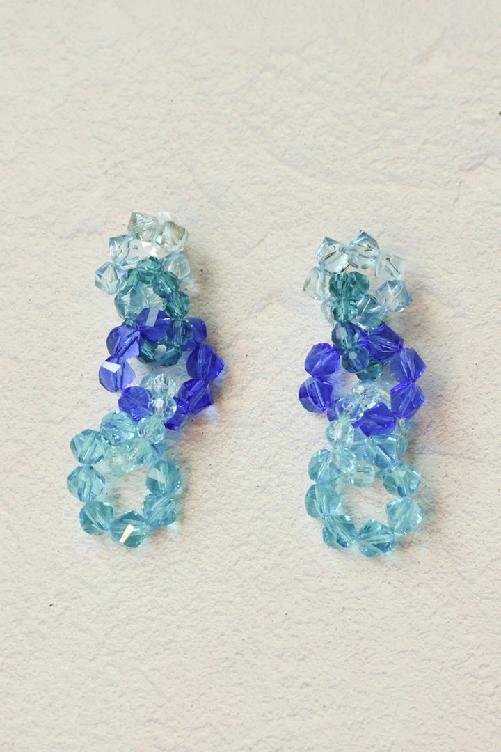 Made from interlocking hoops of brightly colored beaded strands, the Technicolor Beaded Drops are your head turning earrings of the summer. Triple tier drop earring. Post closure. Available in sunset and ocean.