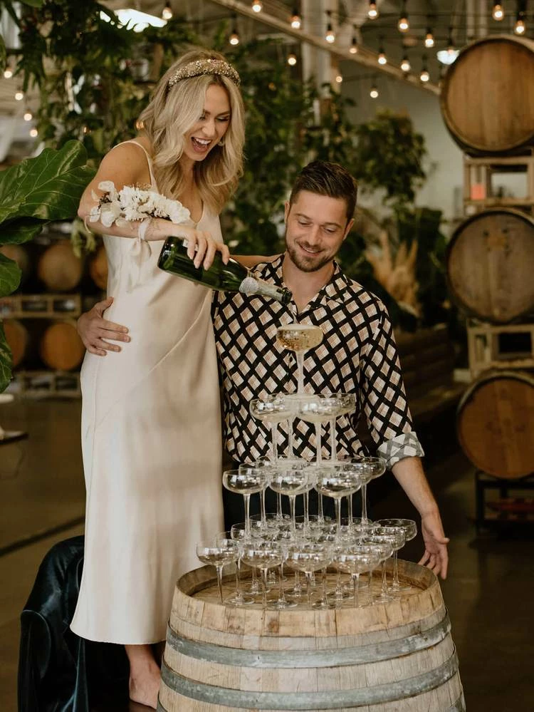 For our our trend-forward brides, wow in this body-skimming satiny dress. V-neck. Midi length.