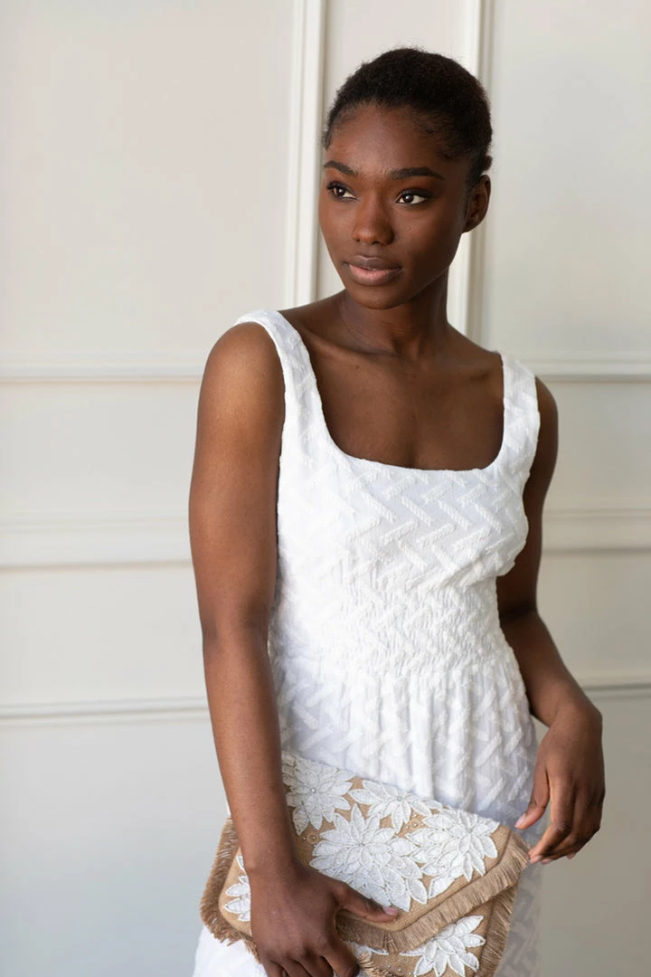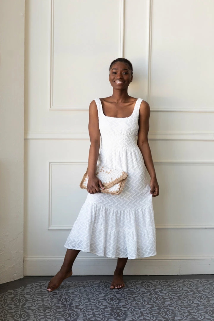 Picnic in park in our Becky Summer Maxi Dress. Ideal for a summer date night or casual bride. Features a square neckline, shirred waist and tiered skirt.