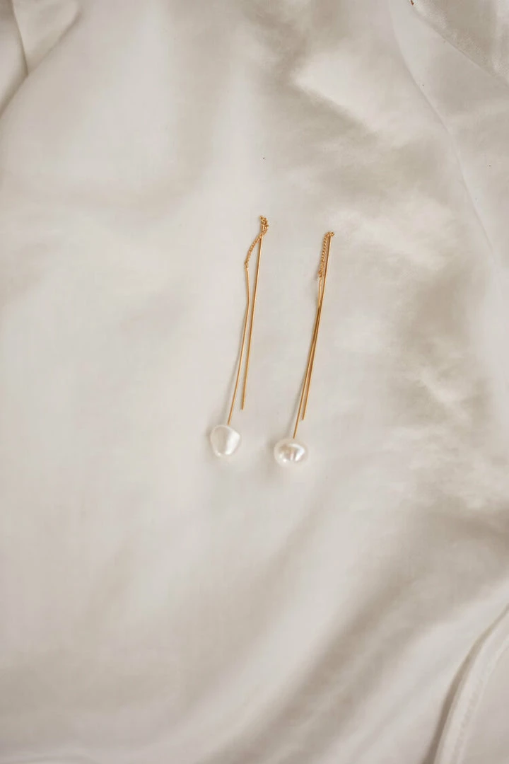 Understated and glamorous, the Aphrodite Gold Drop Pearl Earrings is the perfect wedding day accessory. Inspired by clean lines, these earrings feature a thin gold drop bar, polished off with a single pearl at the end. These also make great bridesmaids’ gifts. Measures 2.5″ from ear to the end of the pearl. Designed in Dallas, Texas.