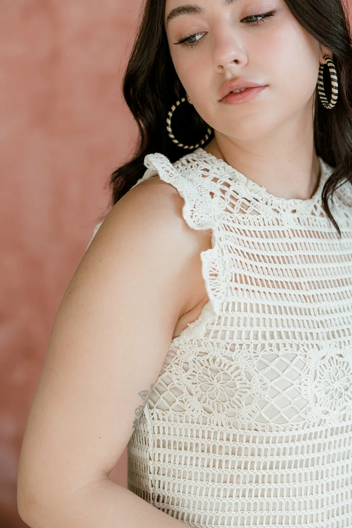 Crochet is one of the hottest trends of 2022, and the Hannah Ivory Crochet Midi Dress is the perfect mix of romantic and playful. This woven wardrobe staple features fun ruffle sleeves and a button back. Pullover style. Fully lined.