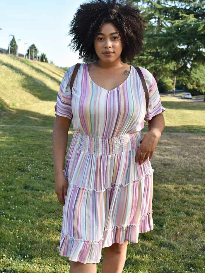Our Malibu Striped Mini is our perfect pick for hot summer days. This plus size mini dress is cut in flowy 100% cotton. It features a smocked waist, V-neckline and tiered skirt.
