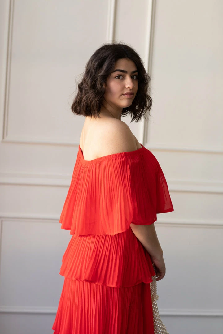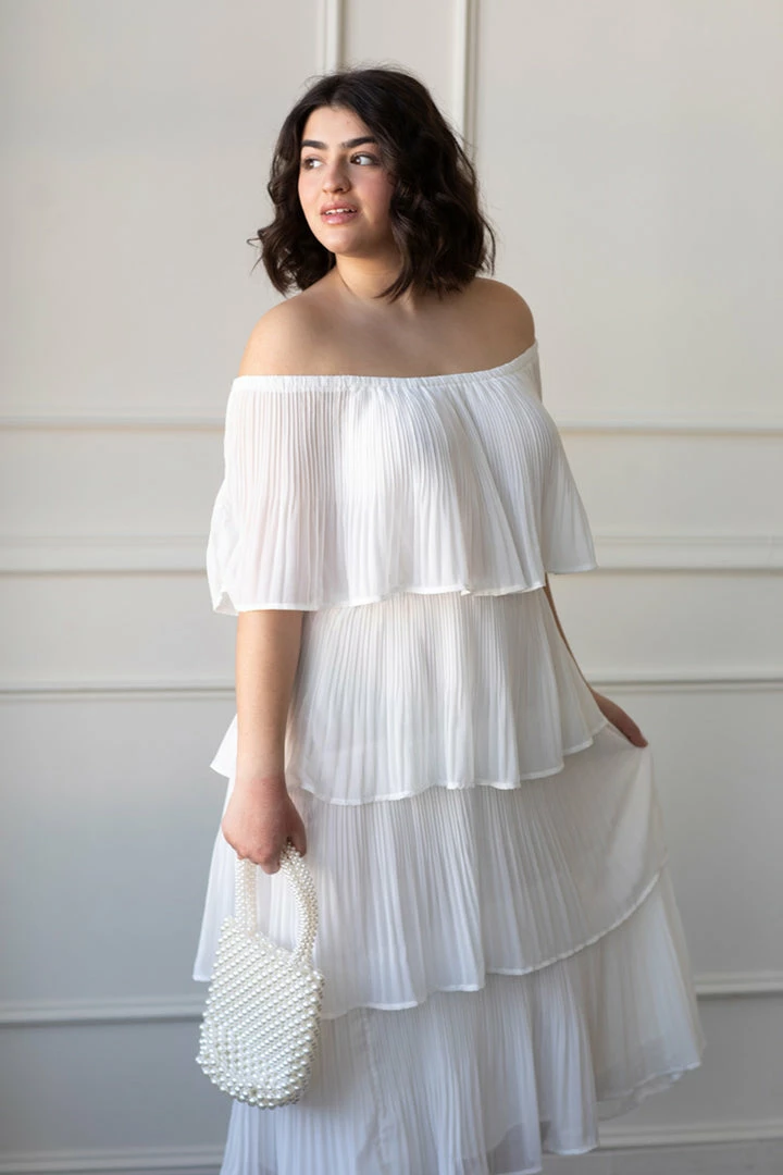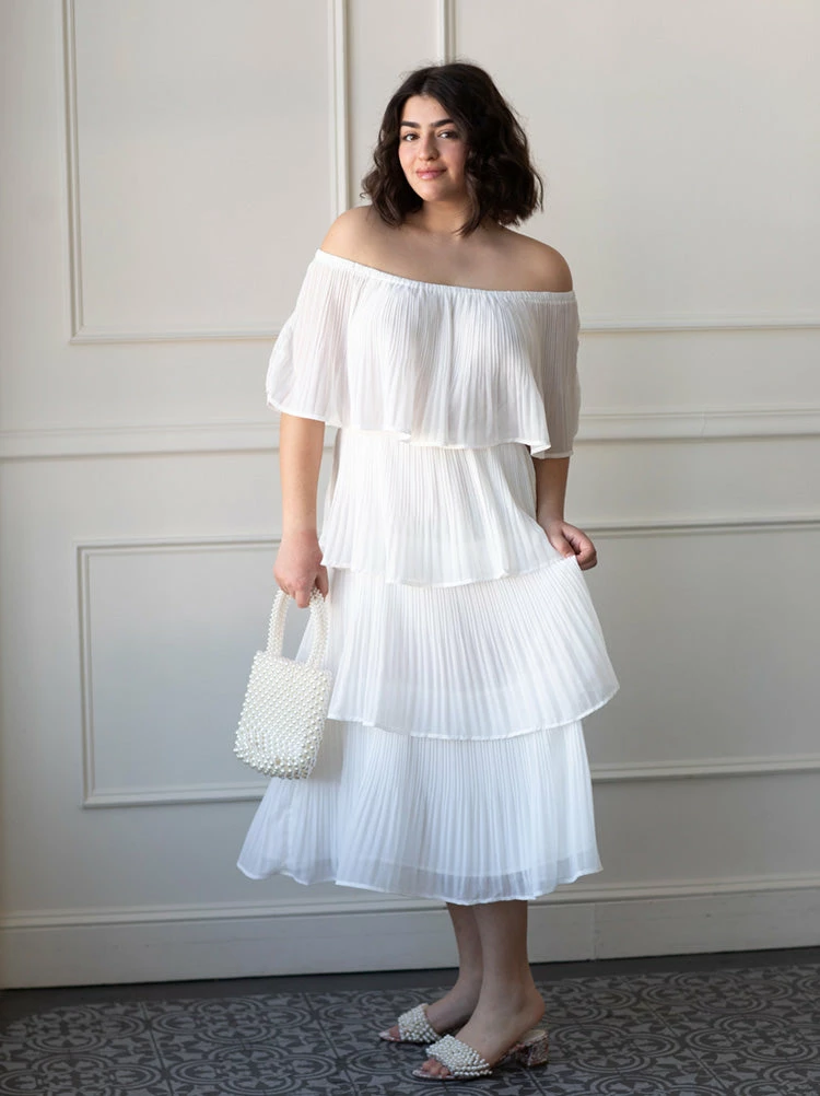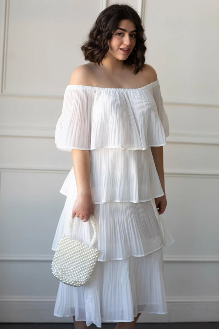 Our Bardot Off the Shoulder Ruffle Plus midi dress is one of Confête’s top-selling styles. The Bardot is cut from soft chiffon in a breezy off-the-shoulder silhouette. Dress it up by sweeping your hair back with a sparkly clip. Available in white and red.