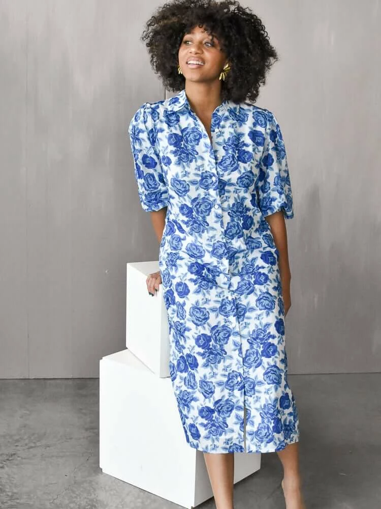 Meet Margot, the easy modern shirt dress every closet needs. Cut from a gorgeous blue rose print cotton, this style features a flattering relaxed button front body that skims the hips, three quarter gathered sleeves, button cuffs, and side pockets. Unlined. This dress is a seasonless favorite – wear with espadrilles in the spring and summer and boots in the winter.