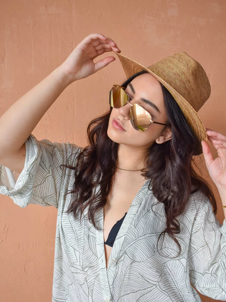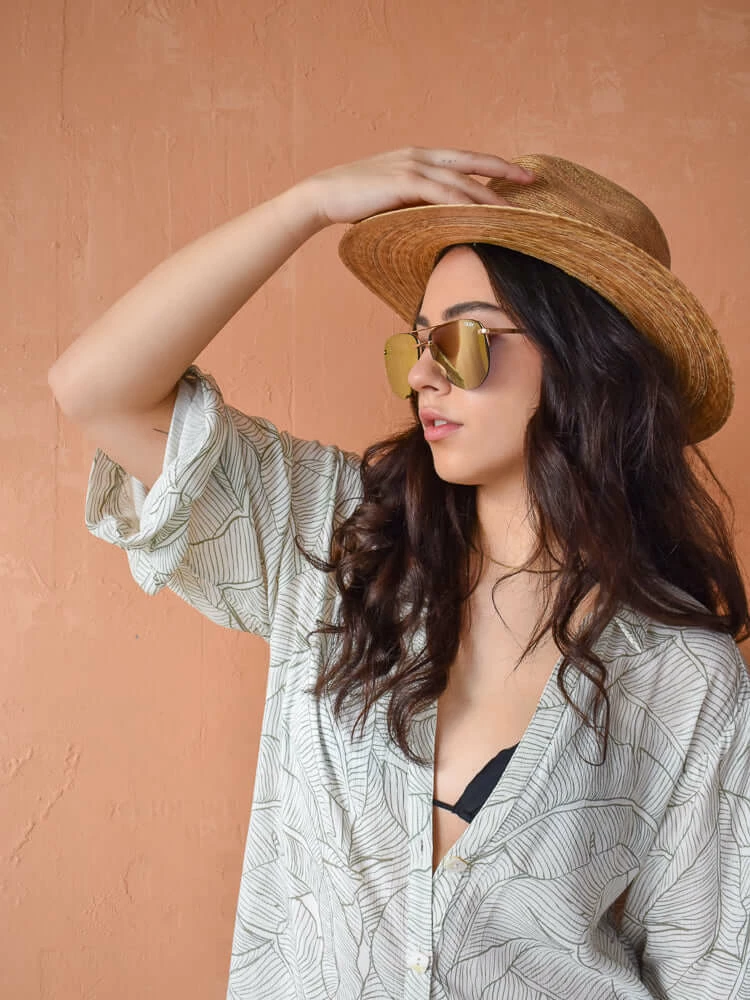 Take summer glam to the next level in the Quay Playa sunnies. These frameless aviators come in both bronze and pink/gold. Pair with the Palma Fedora and Jetset Banana Leaf Shirt for the perfect vacation style outfit.