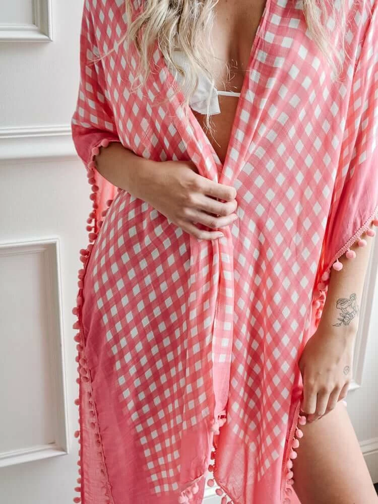 This fun and versatile beach cover-up is the perfect statement piece for a day at the beach. With its bright pink gingham pattern, pom pom detail and easy kimono style fit, you are ready for anything from lounging poolside to even pairing with a white tank and skirt for a beachy daytime look.
