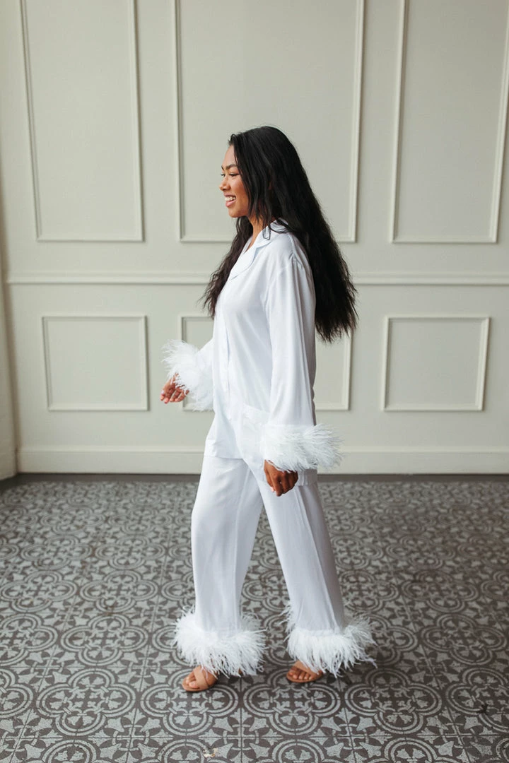 Looking for an iconic bridal fashion moment? Try Sleeper’s Party Pajamas in white for your wedding getting-ready outfit. Detachable feathers along the bottom of the pant are what make these stylish pjs a fashionista favorite.