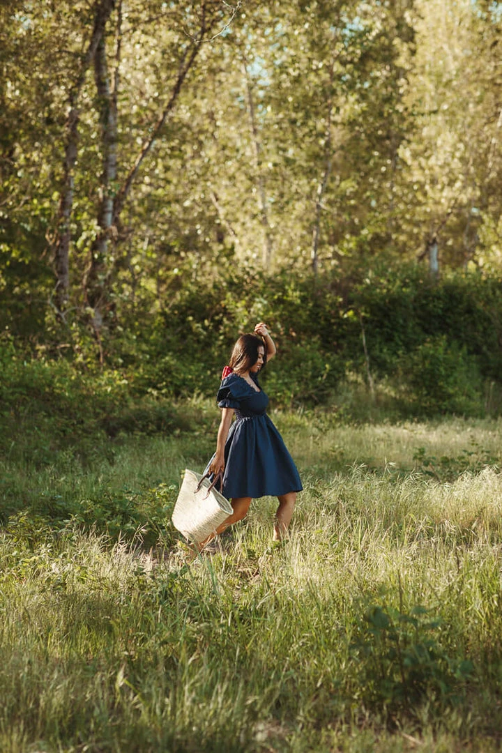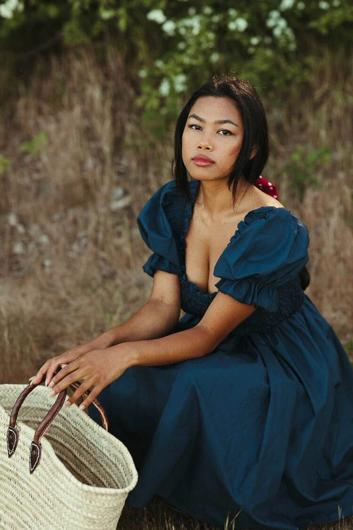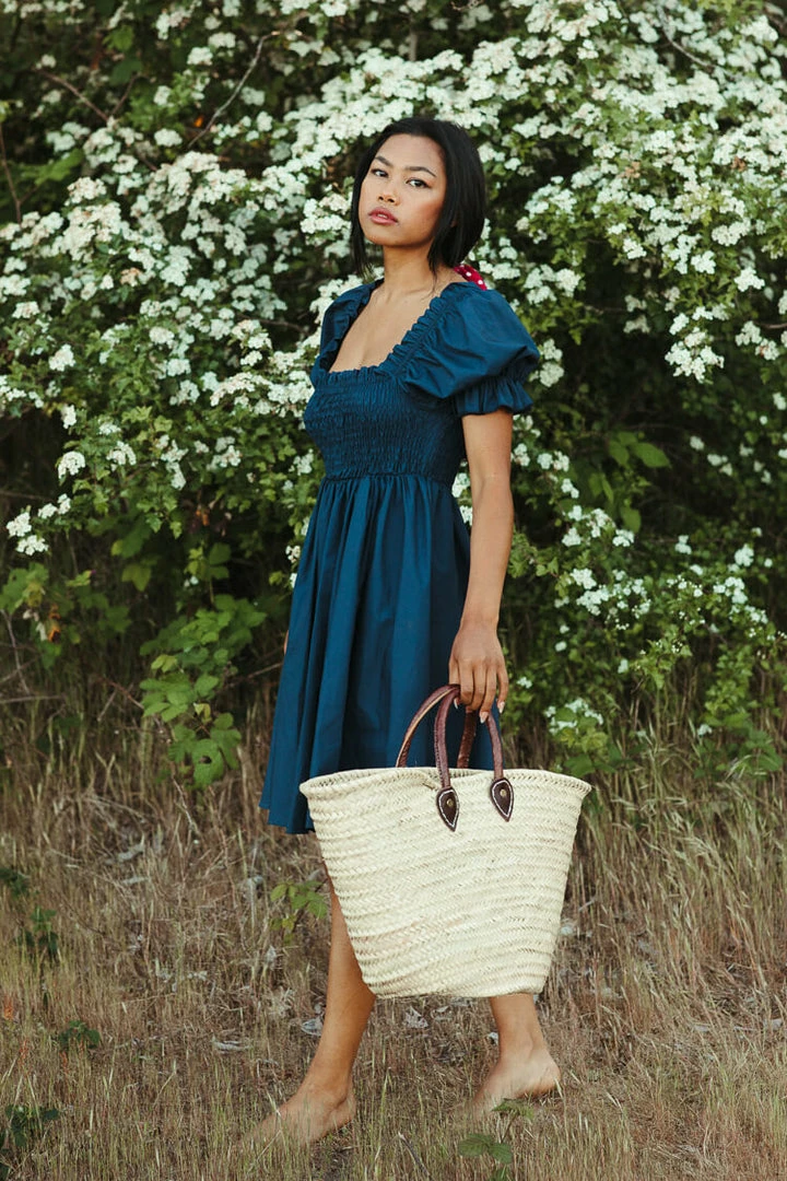 Meet the sweetest and easiest dress of summer: the Nantucket Navy Cotton Mini. This 100% cotton dress features a smocked top with soft, elastic puff sleeves. Mini length. Add a polka dot hair scarf and a straw bag for a daytime look or dress it up with a pair of our Serena Floral Studs for an easy wedding guest look.