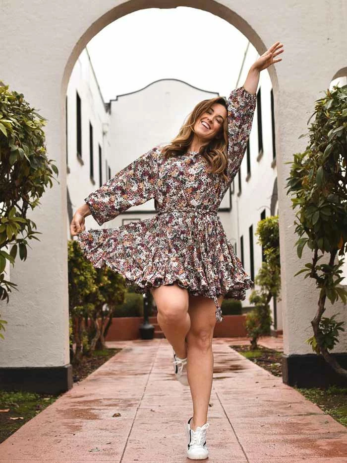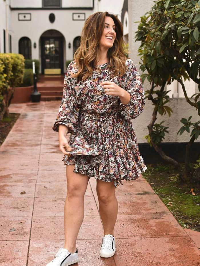 The Francesca Fall Floral Pleated Mini Dress is one of our favorite floral dresses. Cut in an incredibly on-trend pleated, swing style. Its relaxed fit becomes more tailored by tying its’ braided belt. Wear with a leather jacket and sneakers.