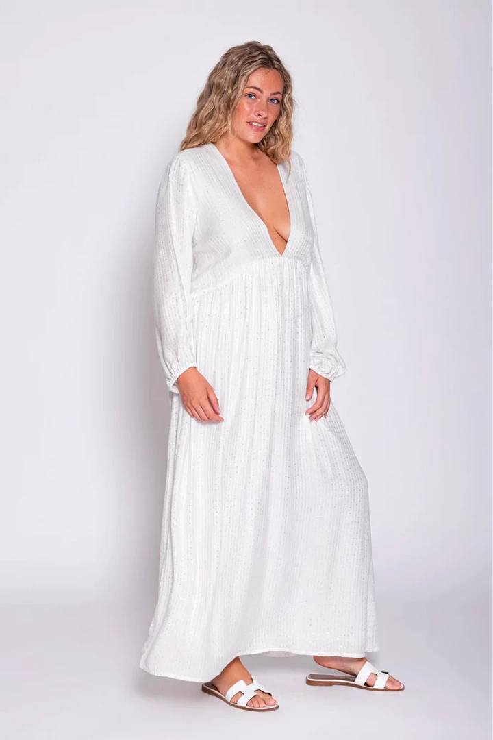 Adorned by sequins and metallic threading, the Chicago dress from Sundress features a V neckline, a deeper V back, and voluminous sleeves. This is a classic honeymoon dress. Pictured in XS/S and L/XL.