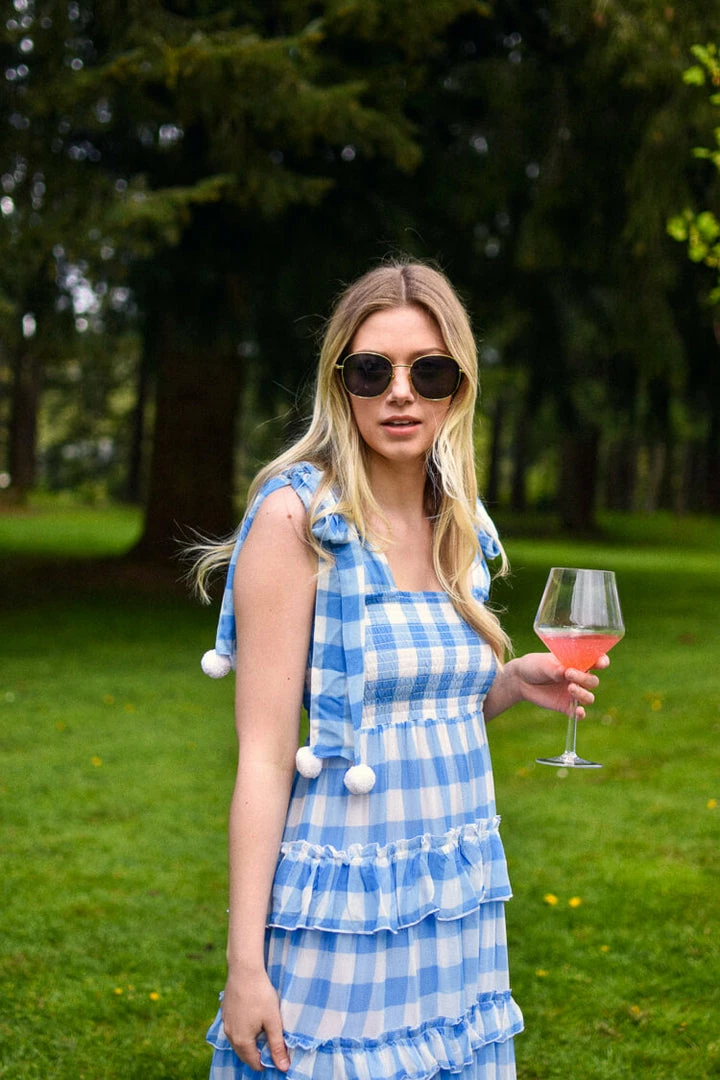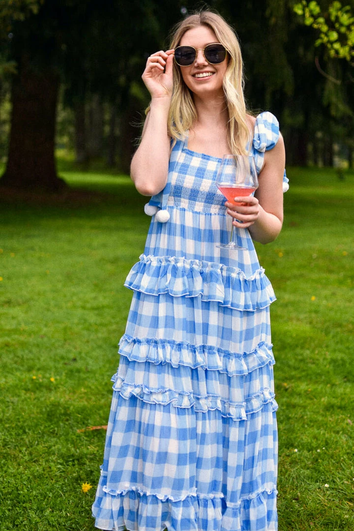 The Berenice Gingham dress is an instant warm weather classic!   Featuring a smocked bodice and square neckline that’s adorned with white pom pom tie shoulder straps. Its floaty tiered skirt in a bold blue and white gingham print make this the ultimate statement dress. Also available in green/pink.