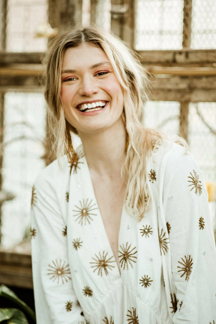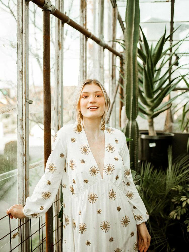 The Chicago Long dress is the ultimate getaway, honeymoon or beach wedding piece. Featuring elaborate gold beading on ivory lightweight non-stretch fabric. Deep V Neckline. Maxi length. Ties at nape of the neck. 62% viscose/ 38% cotton. Hand wash only. Made in India. Pictured in XS/S and M/L.