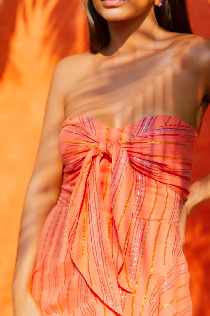 Crafted from colorful metallic stripe pink fabric, the Ilanila dress from Sundress is a bustier-style midi dress. A flounce along the bottom gives . Smocked back.