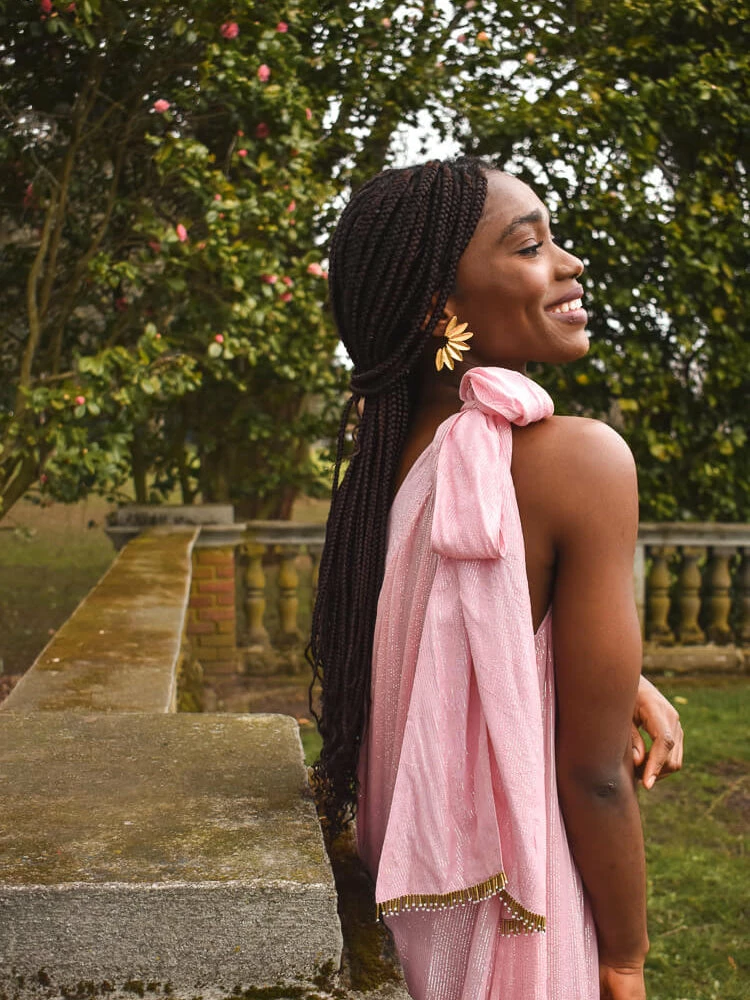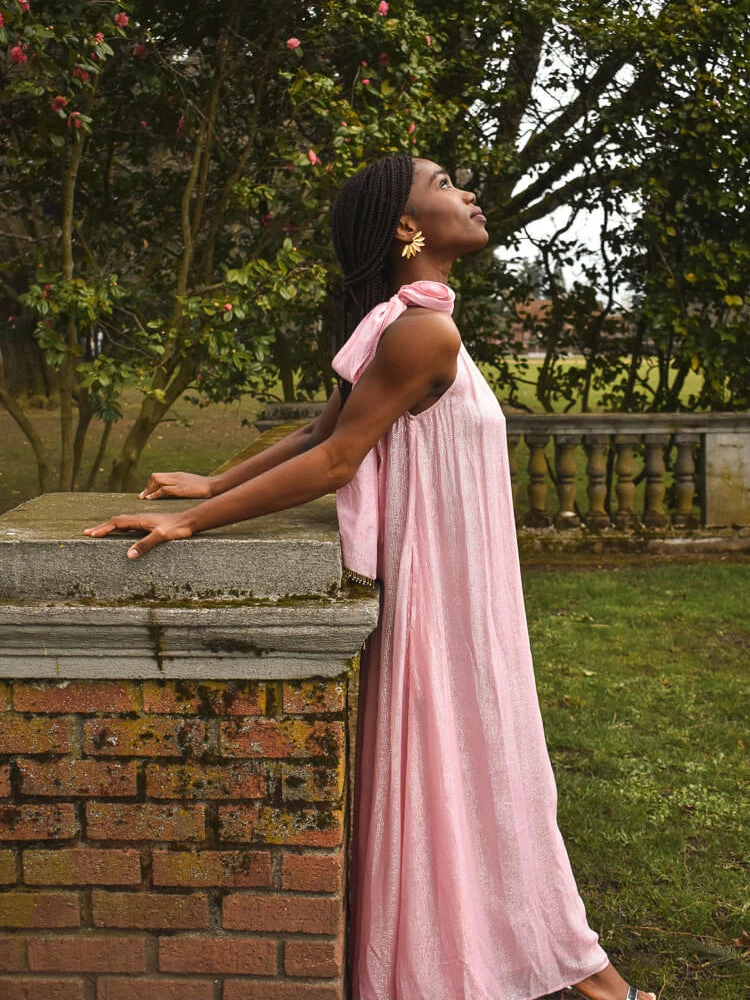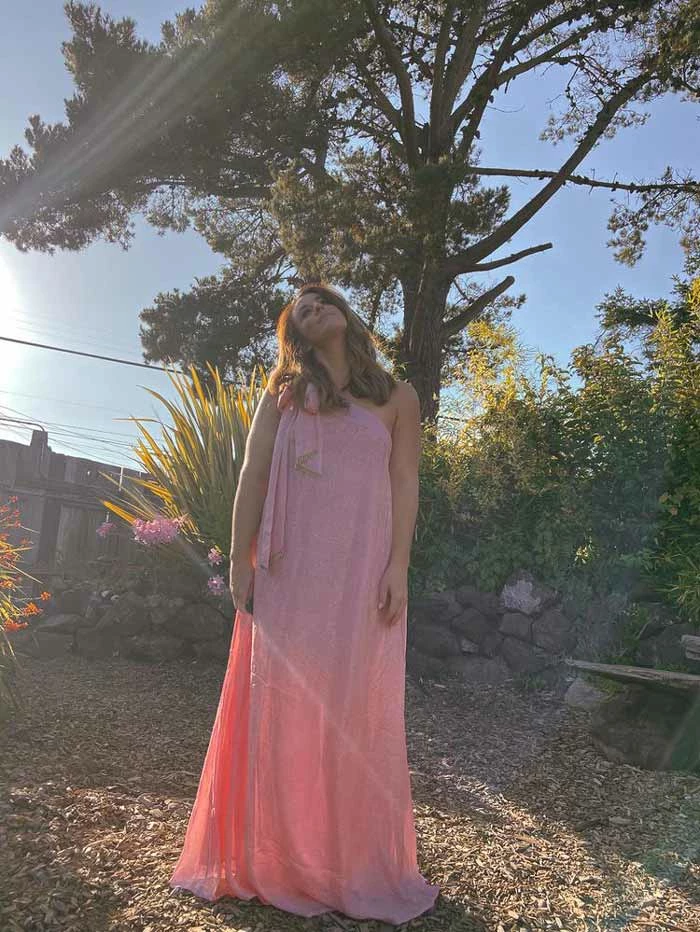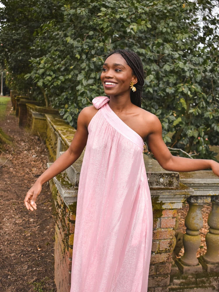 Attending a wedding this fall and donât know what to wear? Look no further than our Clementine dress in Lipstick Pink. This grecian style, one-shoulder dress is cut from a creamy pink fabric with silver metallic threading throughout. As with many of the Sundress brand dresses, itâs all about the details. We love the gold beaded fringe on the shoulder tie. Available on ConfĂȘte in pink and teal.