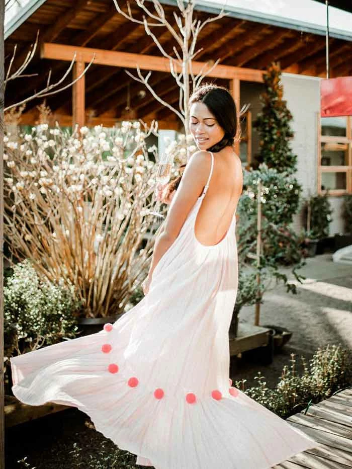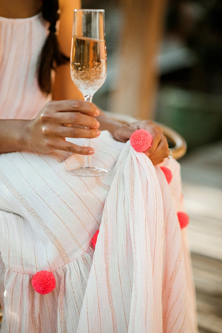 Pretty in pink in our Clea dress. This easy-breezy maxi is the perfect no-fuss vacation piece. Gold metallic thread on lightweight pink gauze. Adjustable straps. Ruffle hem with decorative pom pom detail.