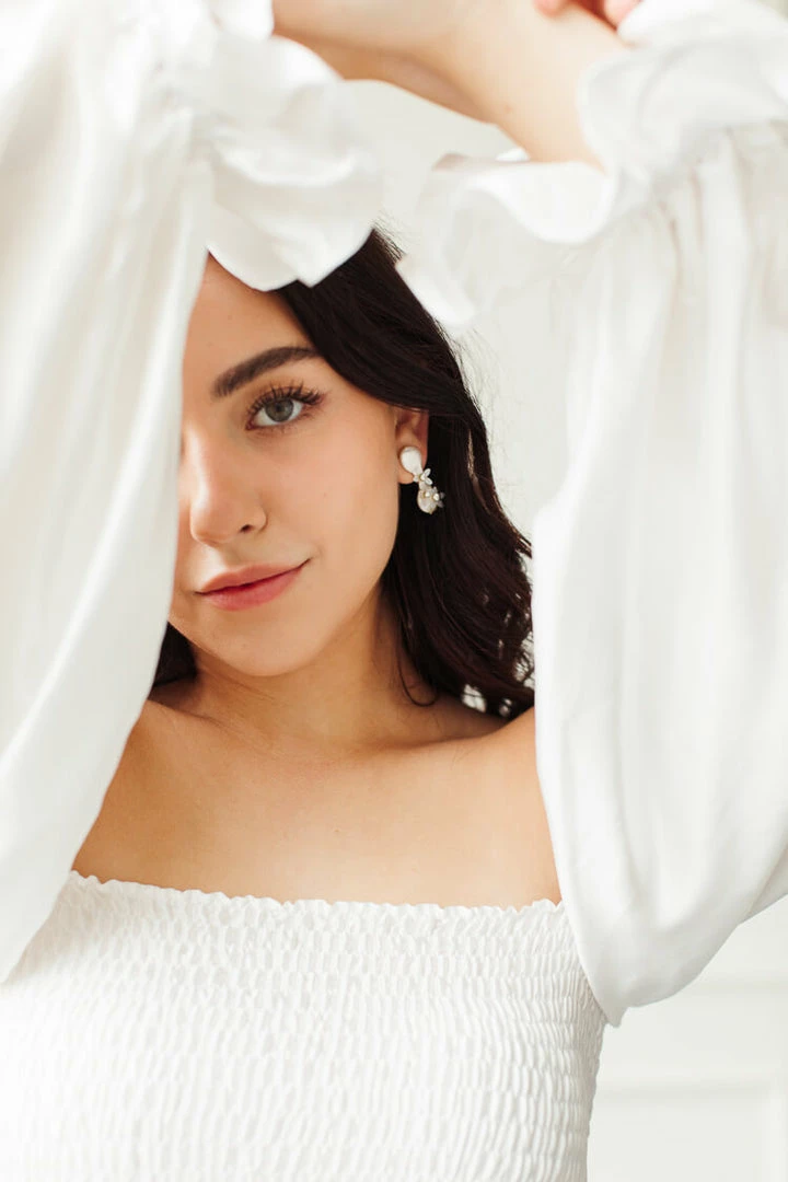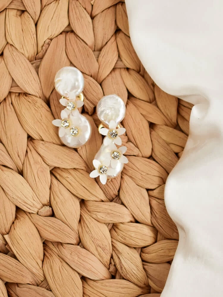 A classic pair of bridal earrings for your big day. The Vivian Pearl Short Dangle earrings are crafted from coin pearl and embellished with dainty, delicate flowers.  This style is the perfect finishing touch to any wedding dress of every type of bride. Post closure. Â