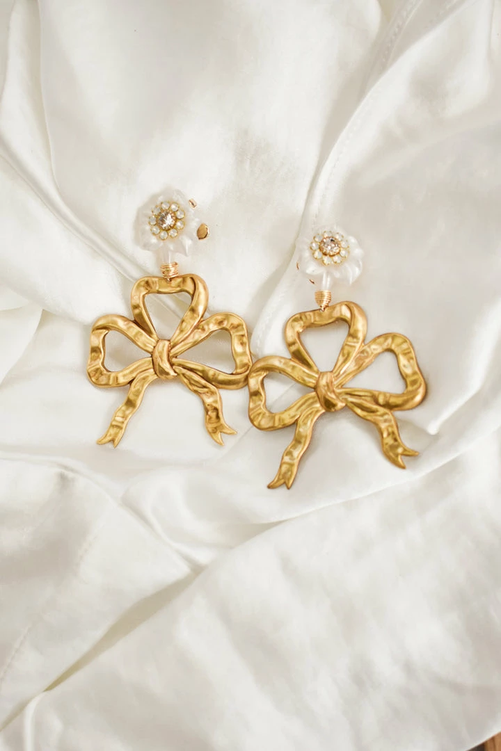 Bridal bows are one of 2021’s biggest bridal trends, and adding a pair of the Winslow Floral Bow Drop Earrings is a great way to try to the trend. From female-owned brand, The Pink Reef, these handmade two-tiered chandelier earrings features a delicate floral stud post and light gold bow.