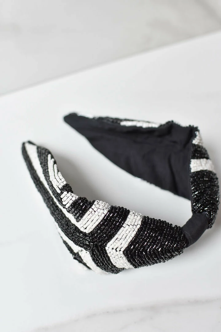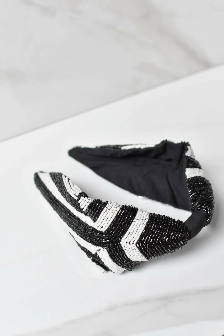 The perfect accessory for all your festive activities – this dazzling headband is embellished with black and white seed beading in a classic striped pattern. Pair with its matching clutch to complete the look.