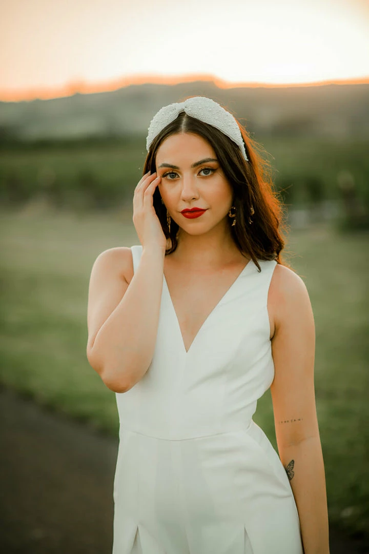 Add a modern yet romantic touch to any bridal ensemble with the Iris Pearl Beaded Headband from Treasure Jewels. This topper features delicate pearl beading along a wide headband. Pair with soft waves and our sheer back white jumpsuit.