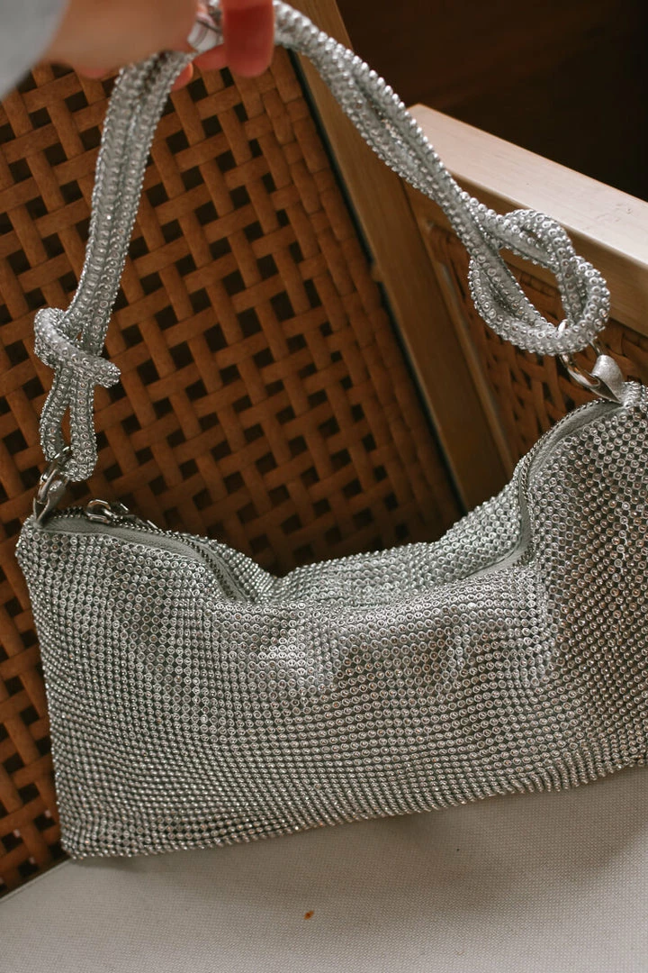 The ultimate party accessory – meet Lulu. Sparkling, clear rhinestones give this “it bag” a silvery sheen. Slouchy style with top zipper. Knotted straps complete the look.